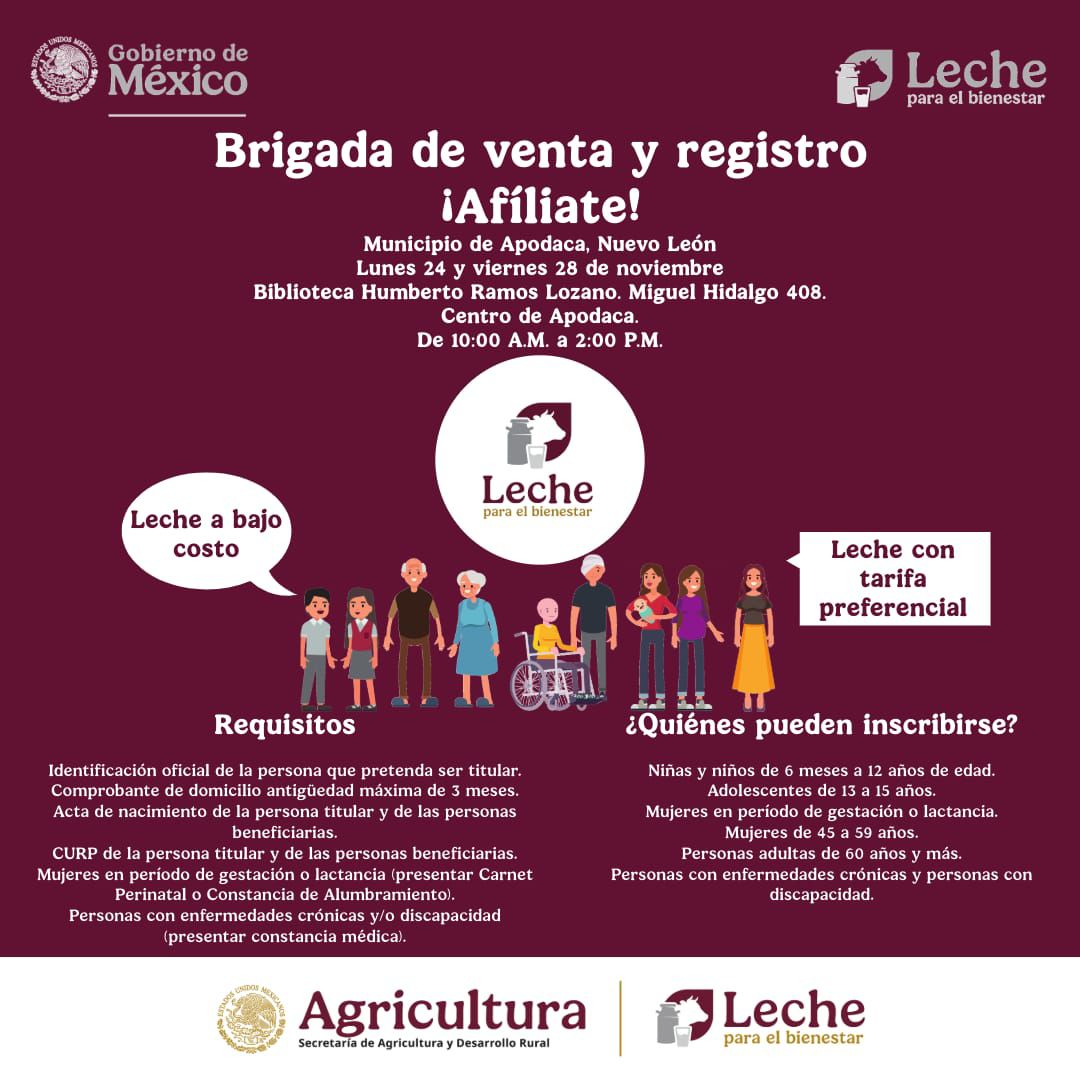 La representación estatal de Leche para el Bienestar anunció que el lunes 24 y viernes 28 se llevará a cabo una brigada de venta de leche y registro para familias interesadas en sumarse a los programas de apoyo alimentario. La jornada se realizará en la Biblioteca Humberto Ramos Lozano, ubicada en Miguel Hidalgo 408, en el Centro de Apodaca, con atención de 10:00 a 14:00 horas.
