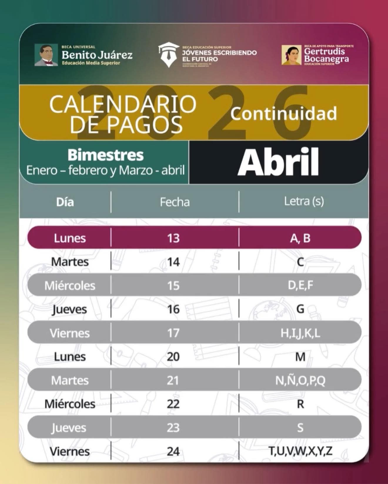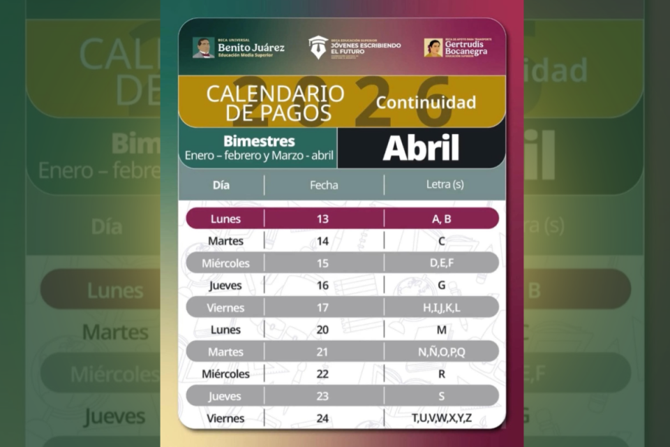 La Coordinación Nacional de Becas para el Bienestar informó que continúan con el calendario de pagos correspondiente al mes de abril, dirigido a beneficiarios de los programas educativos del Gobierno de México, con el objetivo de garantizar la continuidad académica de miles de estudiantes en el país.